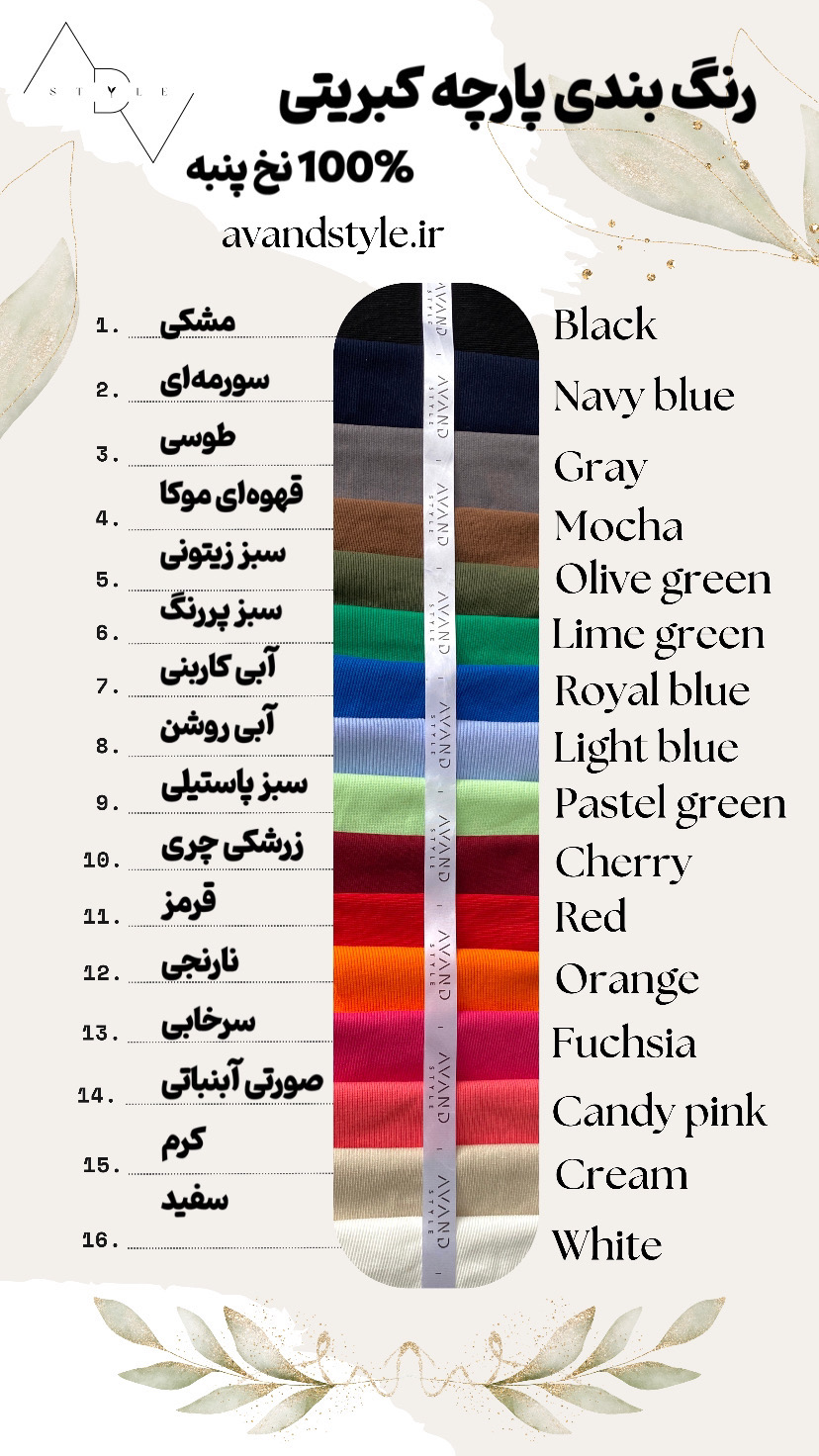 مشخصات اصلیرنگ / سفید / مشکی / کرم / قهوهای / سورمهای / زرشکی / سرخابی / صورتی / آبی روشن / آبی کاربنی / سبز زیتونی / سبز سیدی / سبز پاستیلی / لیموییسایز / 34 / 36 / 38 / 40 / 42 / 44 / 46 / 48 / 50مشخصات فرعیجنس پارچهکبریتی ۱۰۰٪ نخ پنبه گرم بالا
