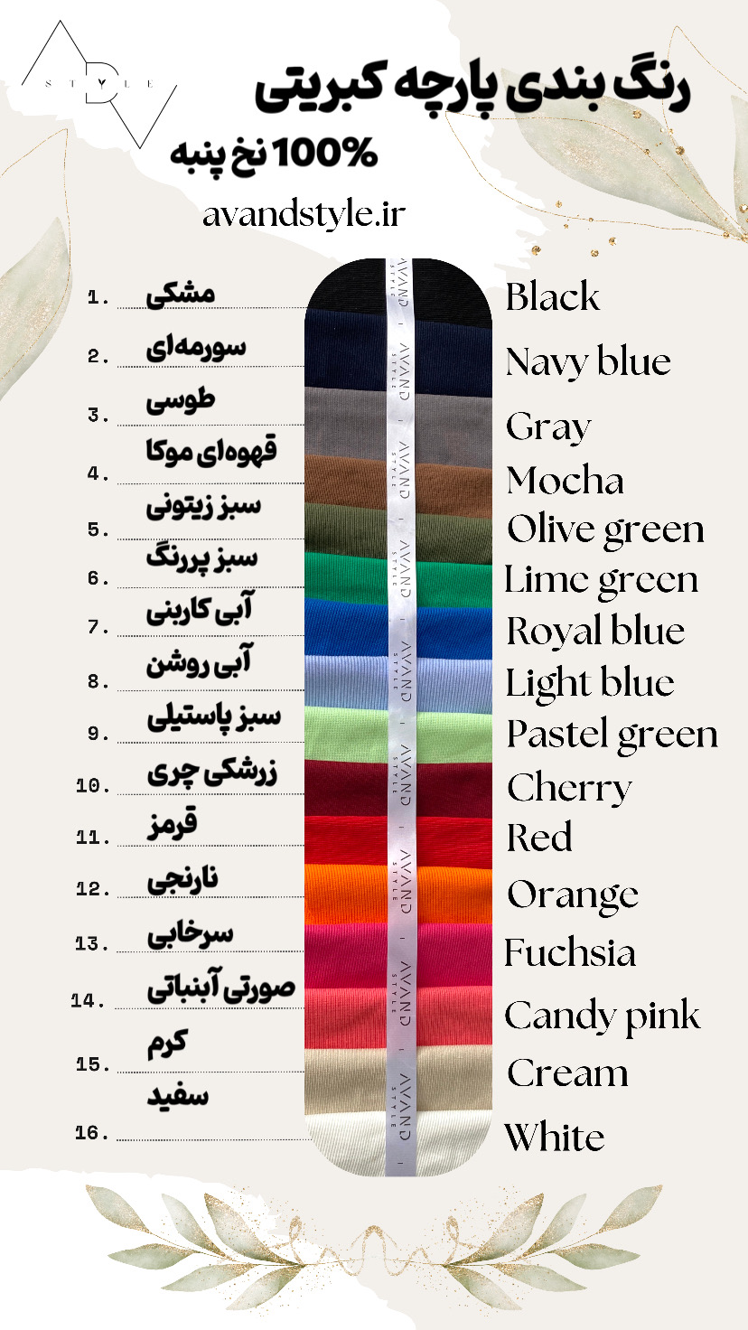 مشخصات اصلیرنگ / مشکی / سفید / کرم / سرخابی / صورتی پاستیلی / زرشکی / قهوهای / سورمهای / آبی روشن / آبی کاربنی / سبز زیتونی / سبز سیدی / لیمویی / سبز پاستلیسایز / ۳۴ / ۳۶ / ۳۸ / ۴۰ / ۴۲ / ۴۴ / ۴۶ / ۴۸مشخصات فرعیجنس پارچهکبریتی کشیقد۴۰ cm